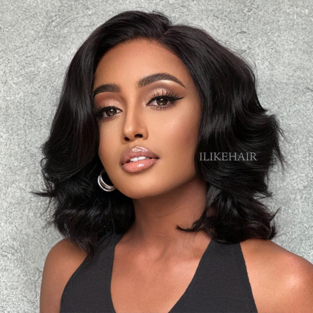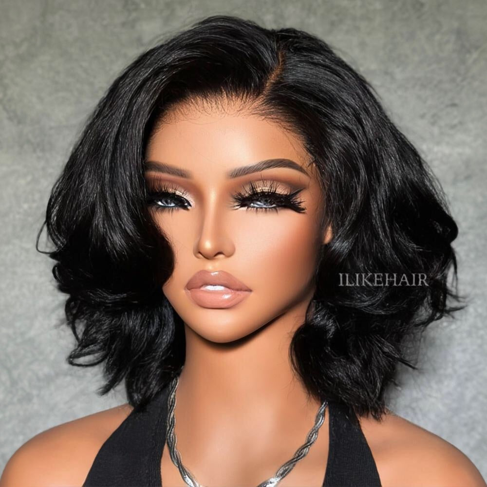 • Put on & Go Side Part Layered Fluffy Bob Lace Closure Wig
