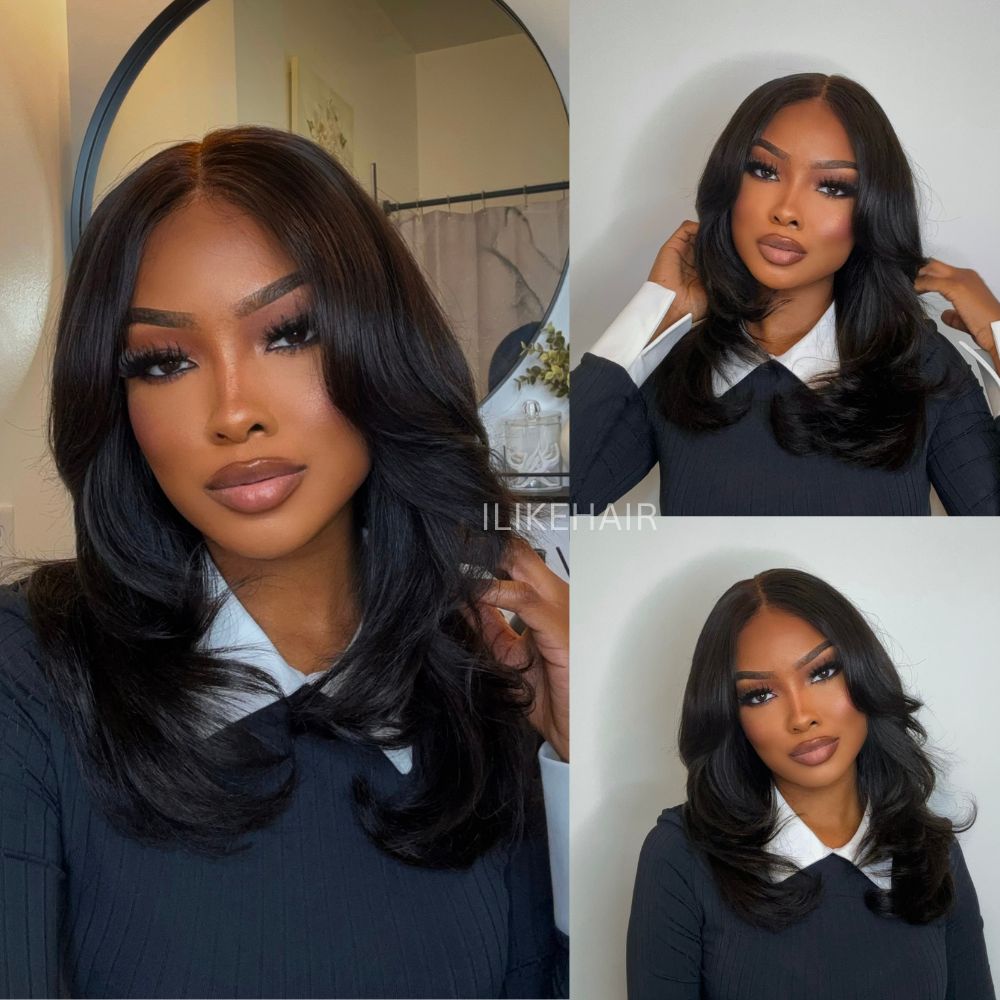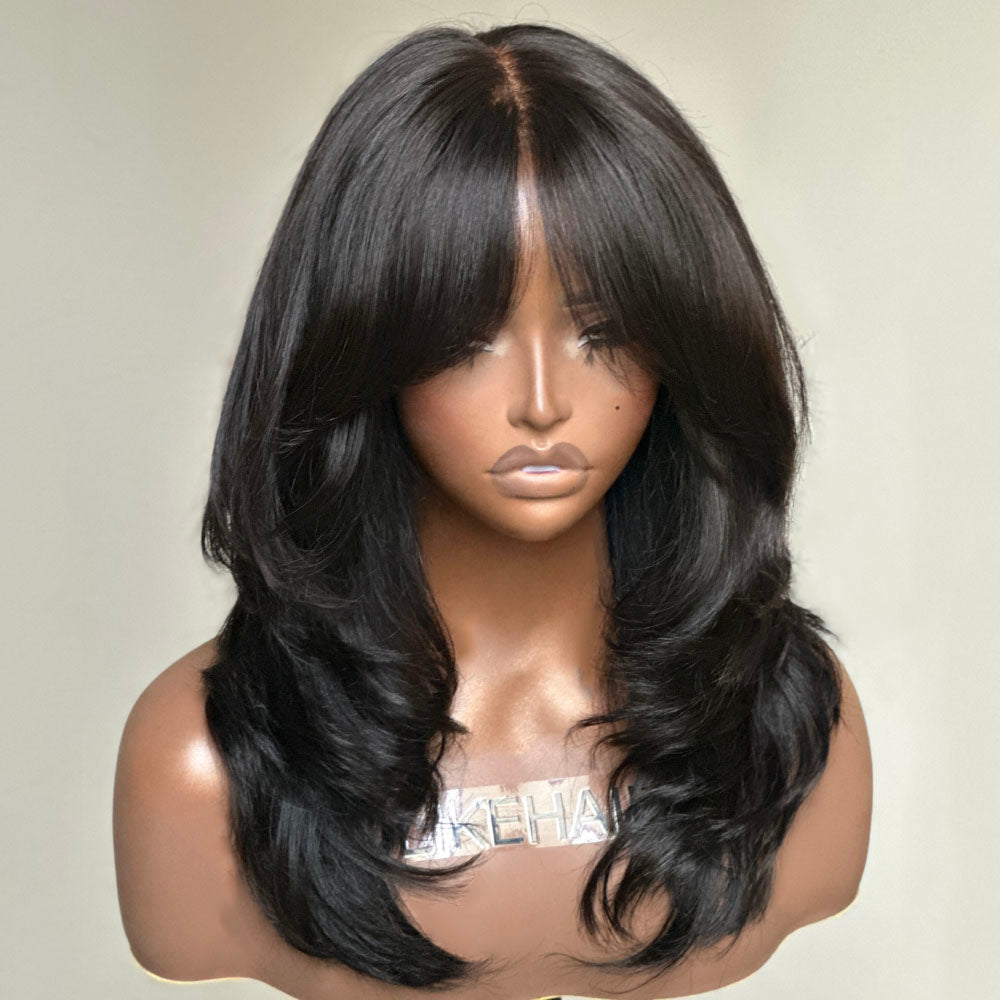 • Put on & Go Layered Wavy Curtain Bangs Pre Cut Lace Closure Wig