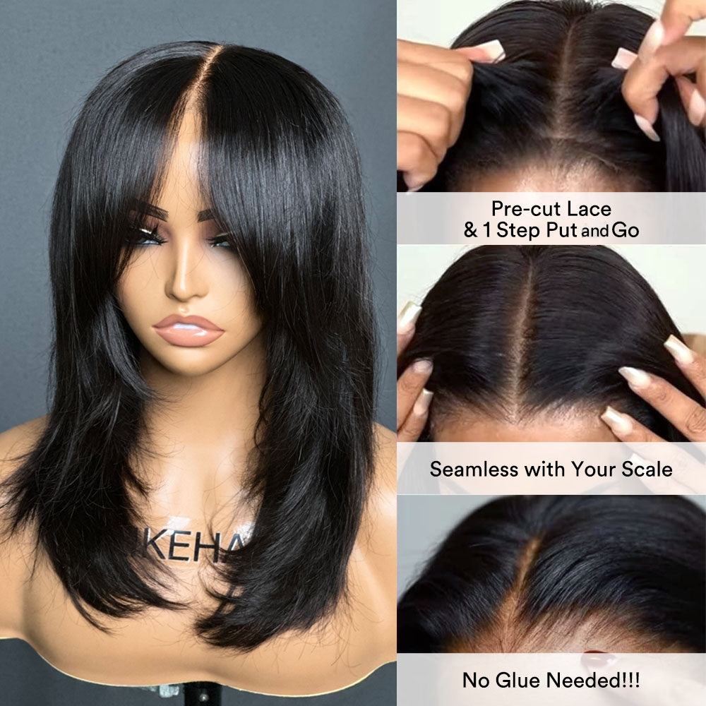Put on & Go Layered Wavy Curtain Bangs Pre Cut Lace Closure Wig