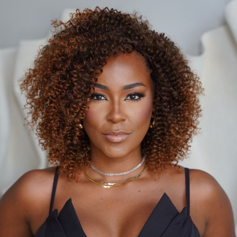• Glueless Dark Brown Mix Light Auburn Curly Wig With Bangs