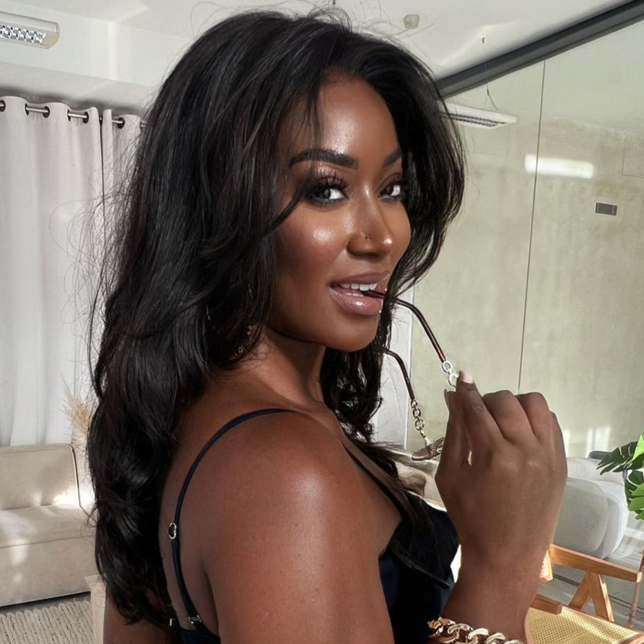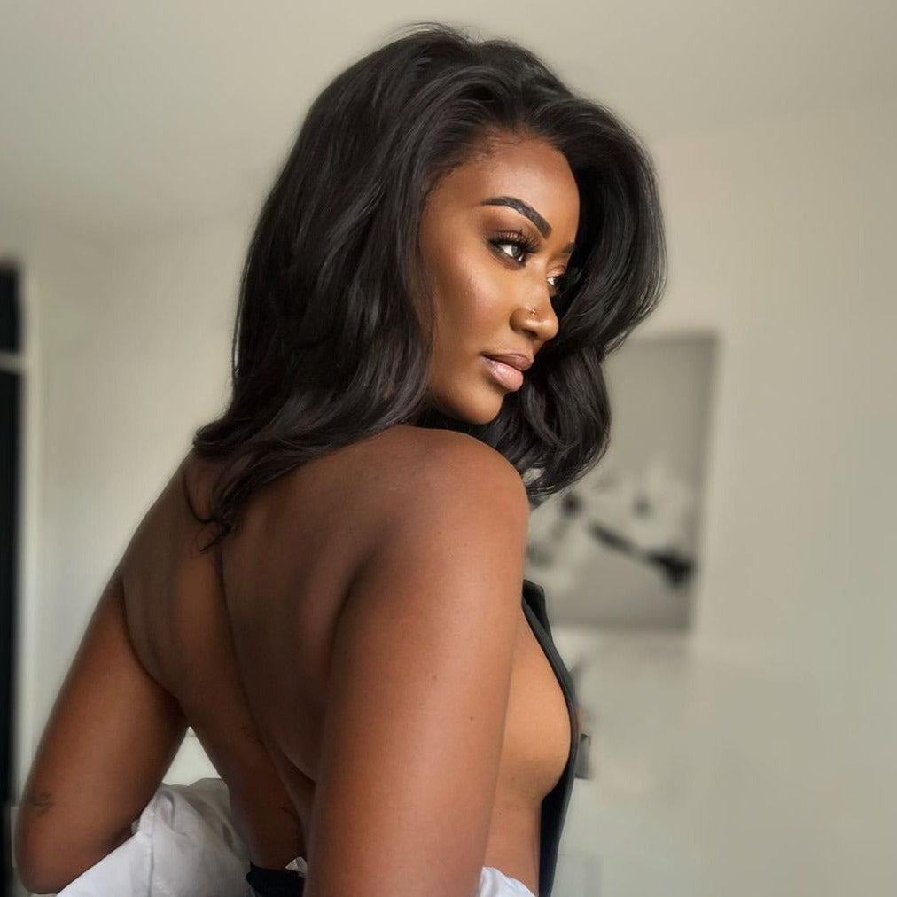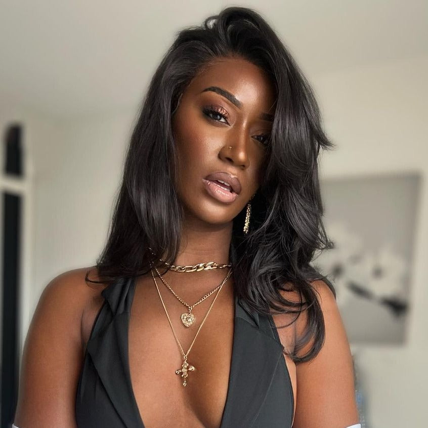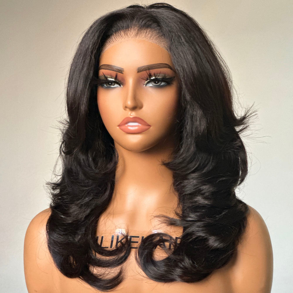 • Layered Cut Wavy Human Hair Lace Front Wig With Butterfly Bangs