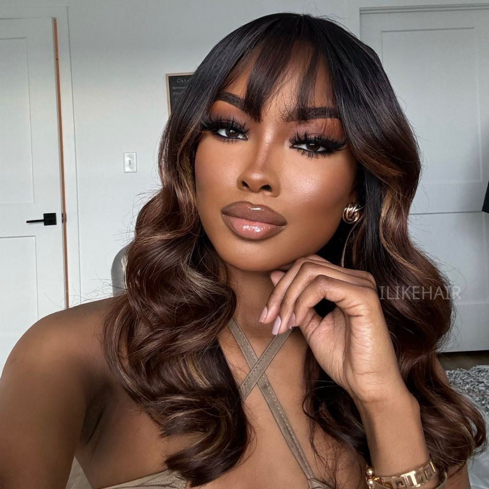 • Ombre Chestnut Brown Highlights Curtain Bangs with Layered Cut Wavy Lace Closure Wig