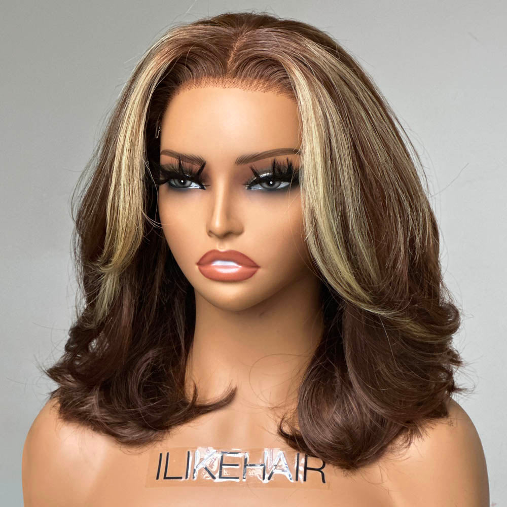 • Short Ombre Chocolate Brown with Blonde Highlights 13x4 Lace Front Wig Human Hair