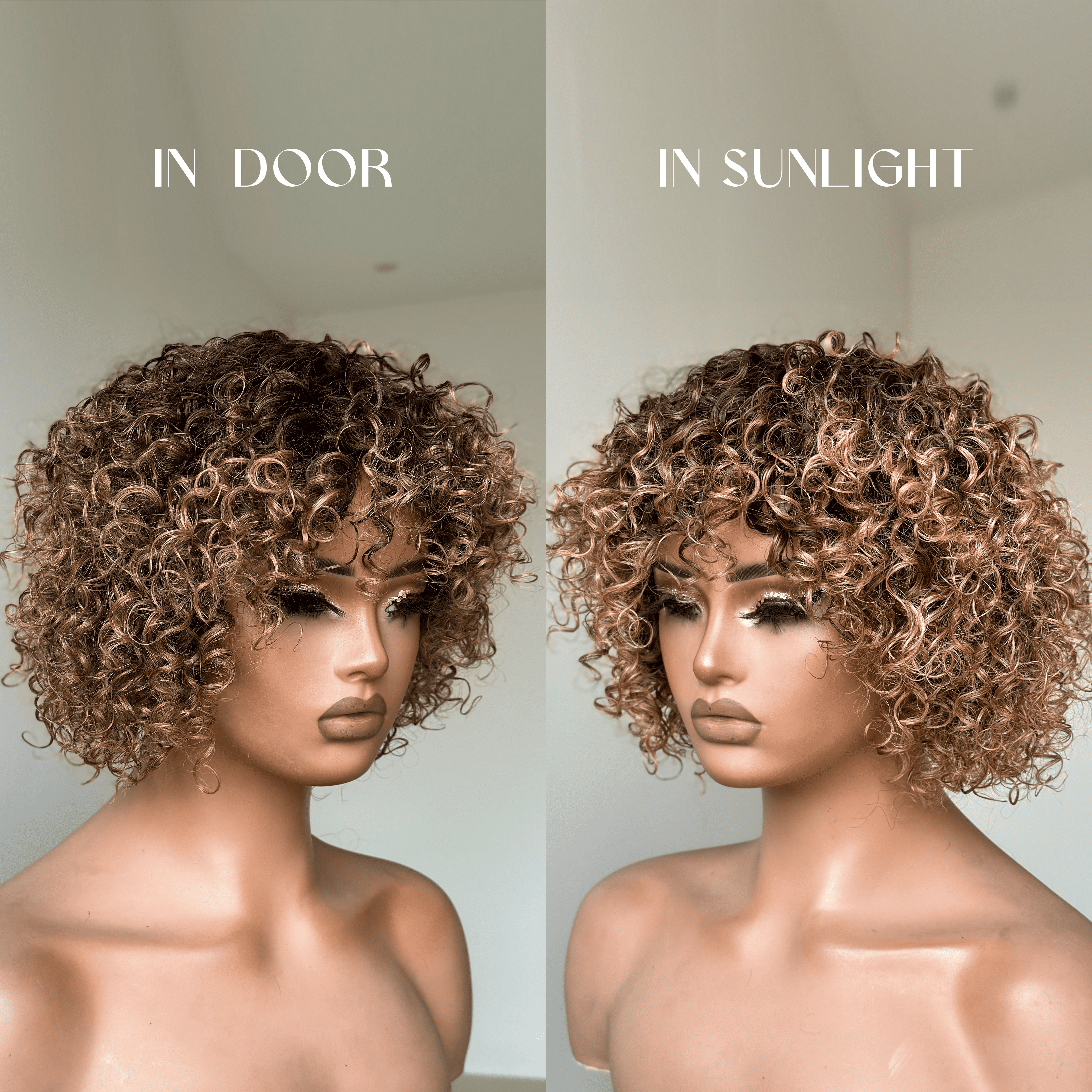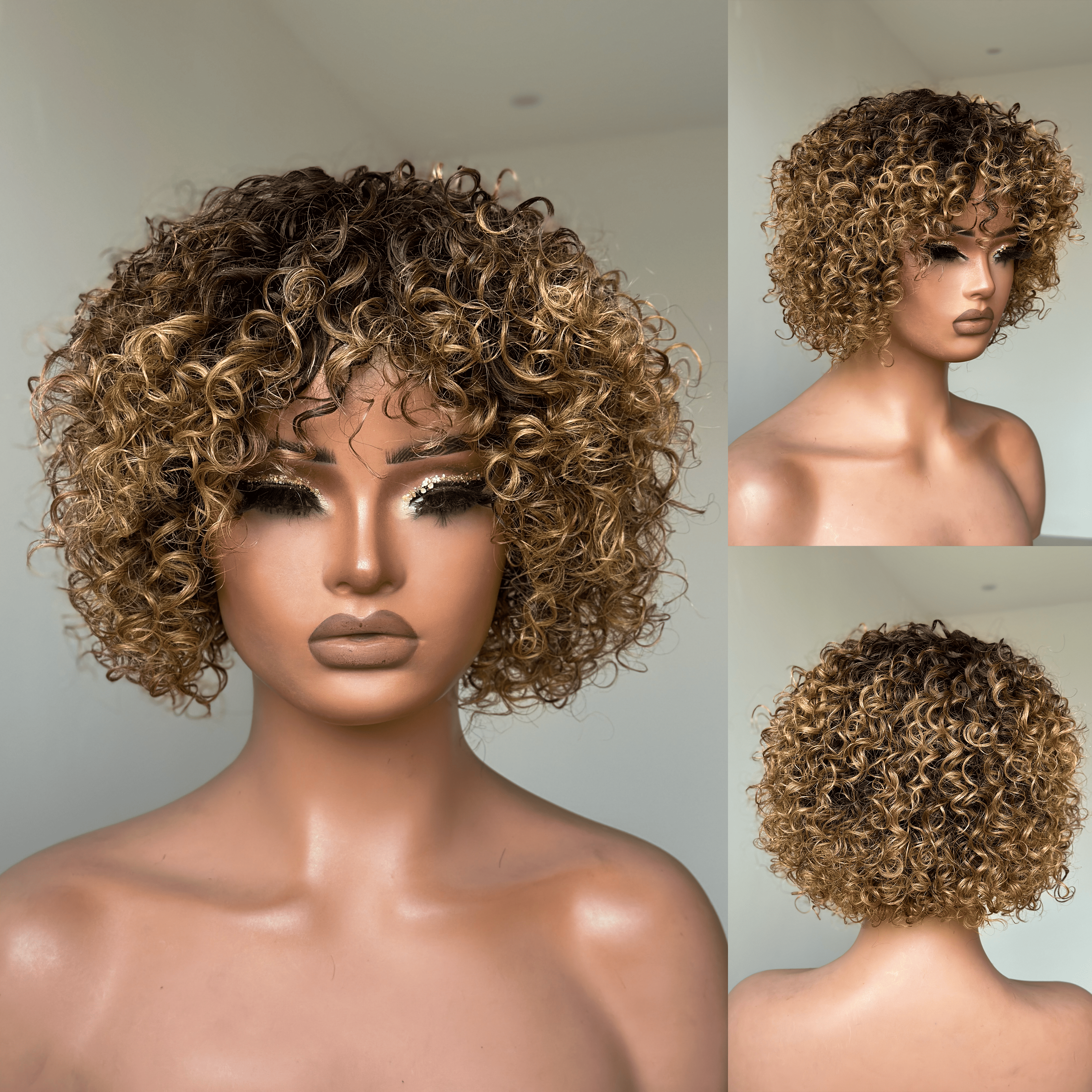 • Chic Ombre Mix Color Short Cut Curly Put On & Go Wig 100% Human Hair